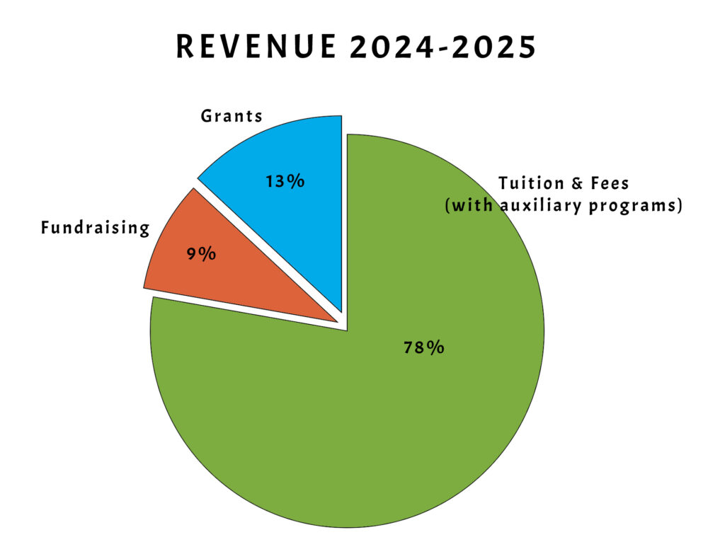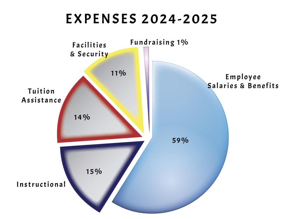 Tuition remains the primary source of revenue for the school. Where do tuition dollars go? The $38,500 tuition for the 2024-2025 school year funded employee salaries and benefits, educational supplies and activities, facilities, security, technology, and general administration of the school, as illustrated below.